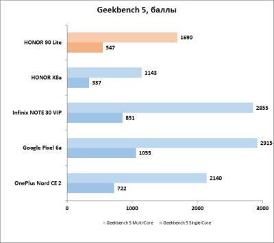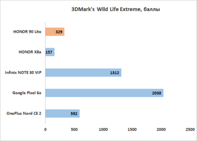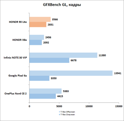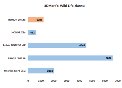 По производительности MediaTek Dimensity 6020 – платформа не выдающаяся, но и не провальная. Да, в ценовом диапазоне, на который метит HONOR 90 Lite, уже встречаются решения намного мощнее вроде первого Google Tensor на Pixel 6a или Mediatek Dimensity более выского уровня, как у Infinix NOTE 30 VIP, но я не назову «лайт» однозначно отстающим. Иных конкурентов или, к примеру, близкий по статусу HONOR X9a он как раз превосходит. Как минимум интерфейс работает гладко, система позволяет запустить любые игры. Но рассчитывать на мгновенный старт любых приложений и гарантированную высокую кадровую частоту в ресурсоемких играх не стоит.