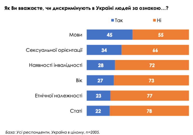 Согласно результатам опроса, 45% респондентов считают, что в стране наиболее распространена дискриминация по языковому признаку.