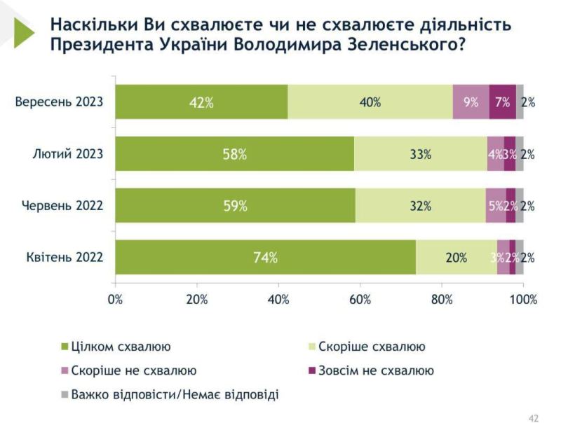 Если в феврале президента полностью или частично поддерживали 90%, то теперь - 82%. Количество граждан, не поддерживающих главу государства, за то же время увеличилось с 7 до 16%. При этом количество тех, кто полностью поддерживает Зеленского, с февраля по сентябрь упало на 16%.