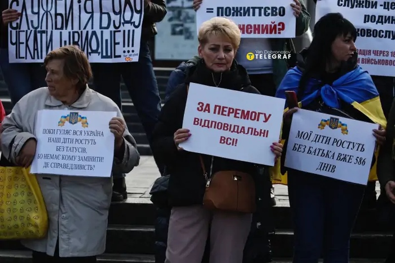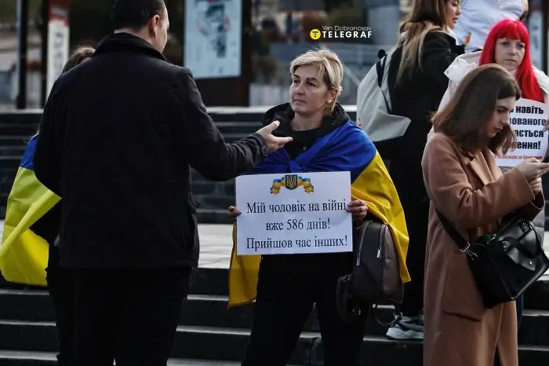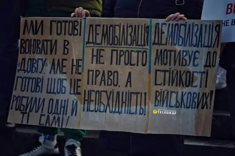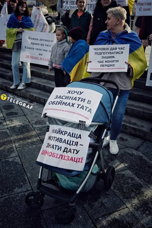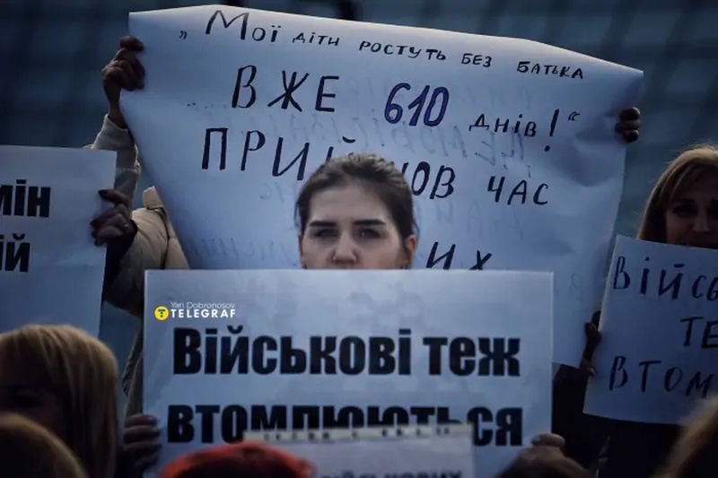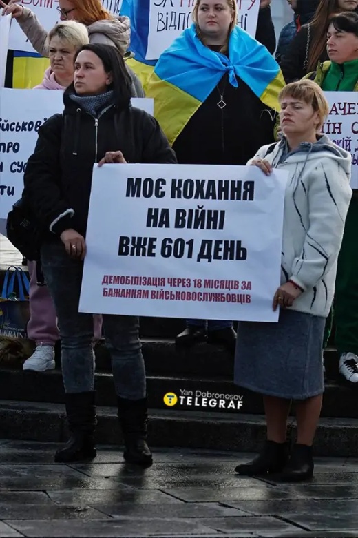 Семьи военных утверждают, что их воюющие отцы, мужья, сыновья, братья, женихи не проходили ротацию с февраля 2022 года. ВСУшники истощены физически и морально, и нуждаются в отдыхе и в психологическом перерыве. В руках участники митинга держали плакаты с призывами к скорейшей демобилизации их родных: «Лучшая мотивация — знать дату демобилизации», «Я хочу засыпать в объятьях папы», «Мой муж на войне уже 586 дней. Пришло время других», «Мои дети растут без отца уже 610 дней. Пришло время других».