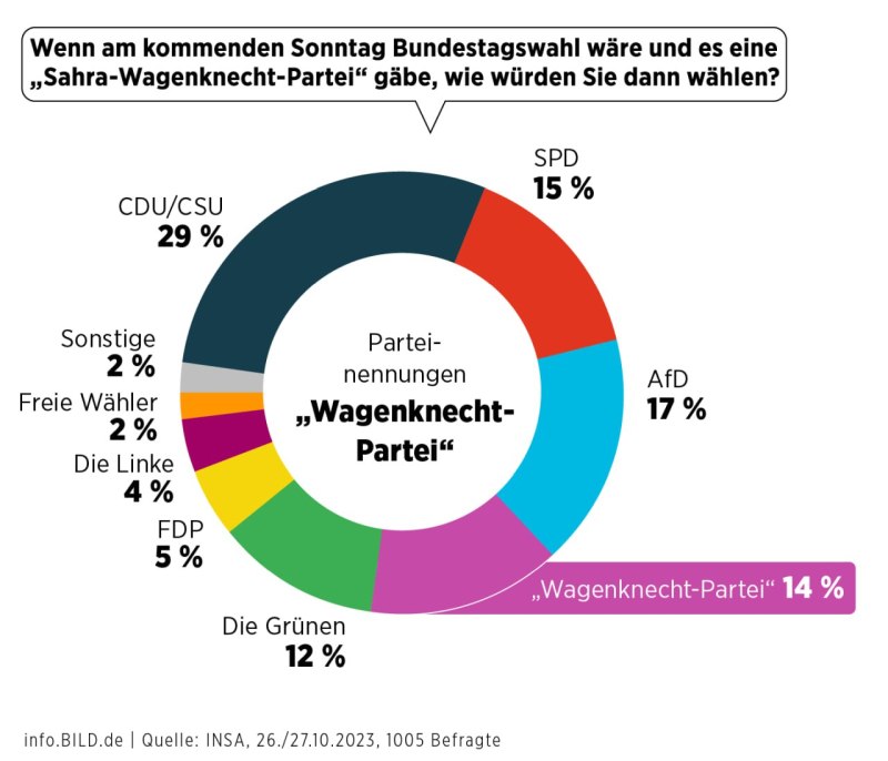 Теперь политик создала свою собственную партию. Как оказалось, её позиция близка многим немцам. Так, по данным опроса, проведенного Bild, за неделю рейтинг партии поднялся с 12% до 14%, сравнявшись с правящей СДПГ и перегнав «Зеленых» и «Свободных демократов», входящих в коалицию «светофора».