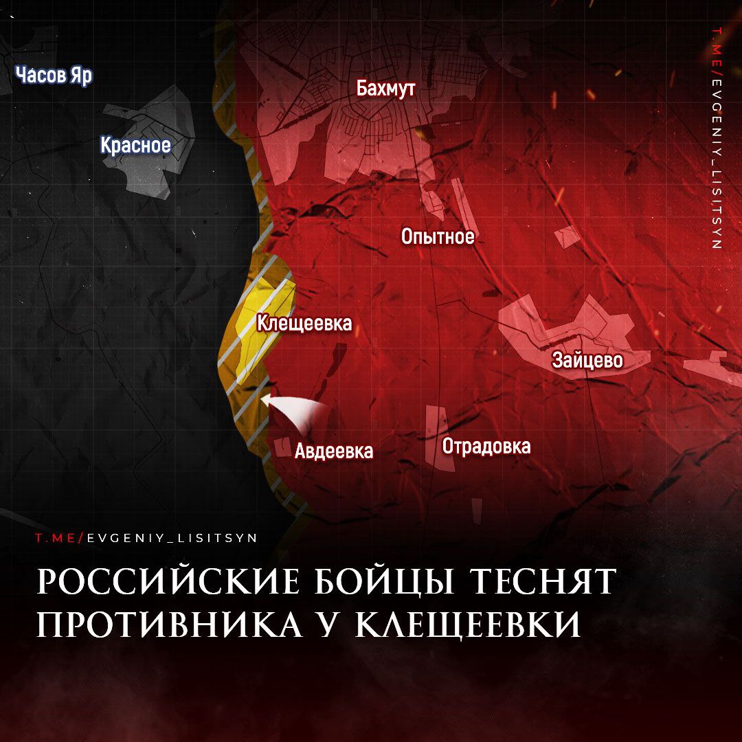 На АРТЁМОВСКОМ НАПРАВЛЕНИИ противник пока оставил попытки атак в районе КЛЕЩЕЕВКИ и АНДРЕЕВКИ. По данным разведки враг ведёт перегруппировку в этом районе. Пока же российской армии удаётся этим пользоваться, наши бойцы отбрасывают силы противника от железнодорожной линии в направлении западных окраин КЛЕЩЕЕВКИ.