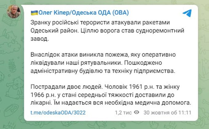Одесская ОВА сообщает о повреждении административного здание и техники предприятия в результате двух «прилётов». Возник пожар, который уже потушили. Пострадали два человека.