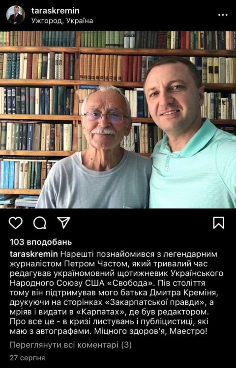 Языковый омбудсмен Тарас Креминь грубо спалился на Пушкине. Мовный шпрехенфюрер опубликовал на своей странице фотографию с «легендарным журналистом Петром Частом», который много лет редактировал украинский еженедельник украинского народного союза США «Свобода».