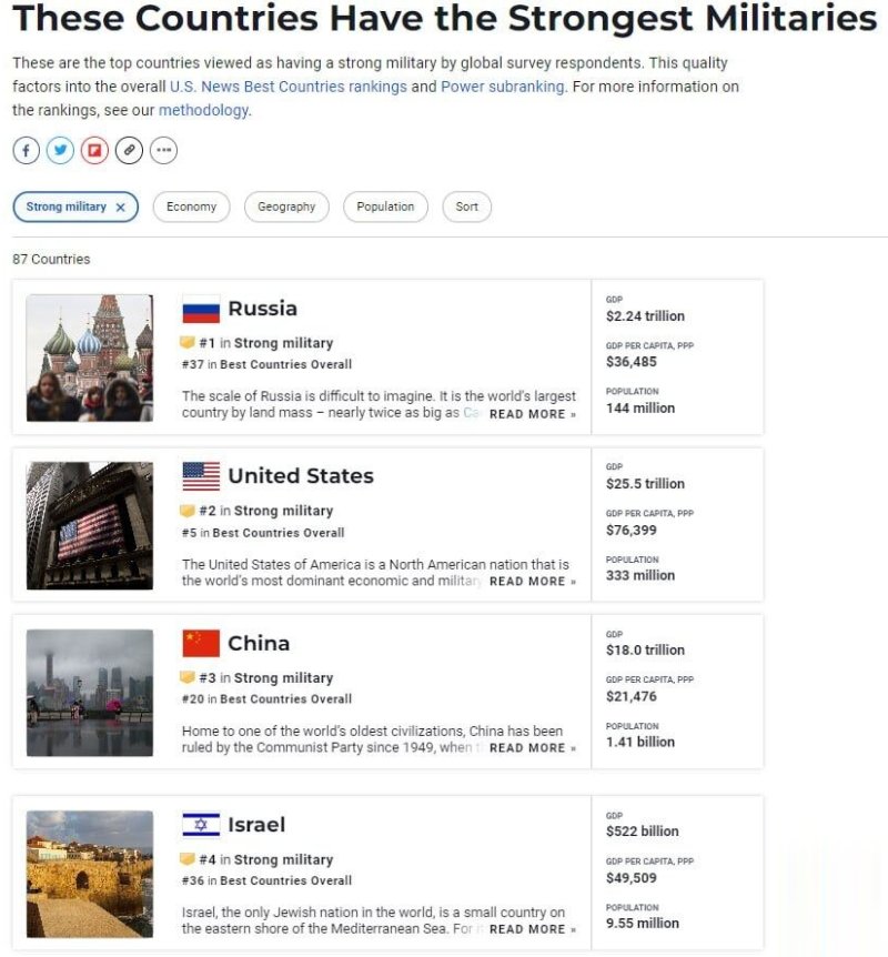 В публикации говорится, что мощь армий стран оценивалась на основе мнений респондентов глобального опроса. Этот критерий учитывался при составлении общего рейтинга лучших стран по версии US News & World Report в подкатегории «Сила».