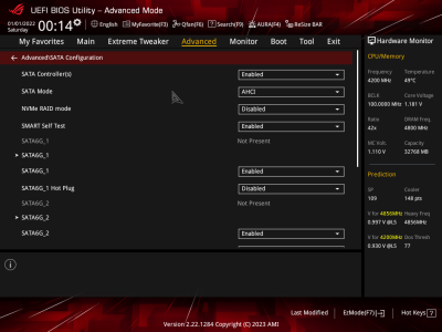 ROG Crosshair X670E Hero оснащена шестью портами SATA 6 Гбит/с — четыре из них подключены к чипсету и поддерживают RAID. Разъемы с маркировкой E1 и E2 работают при помощи контроллера ASMedia ASM1061, подключенного к линии PCI Express от набора логики X670E.