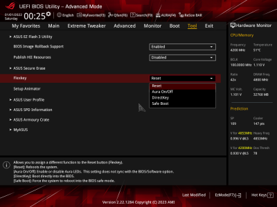 Традиционно UEFI BIOS материнских плат ASUS оснащен такими полезными функциями, как EZ Flash 3 Utility и Q-Fan. При помощи первого мини-приложения мы можем всего за пару минут обновить прошивку BIOS, при помощи второго — настроить работу подключенных к материнской плате вентиляторов. При активации функции Flexkey кнопка перезагрузки на корпусе системного блока значительно увеличивает свою функциональность. С ее помощью можно управлять эффектами подсветки AURA SНТС или же активировать опцию DirectKey — быстрый вход UEFI BIOS сразу после перезапуска ПК.