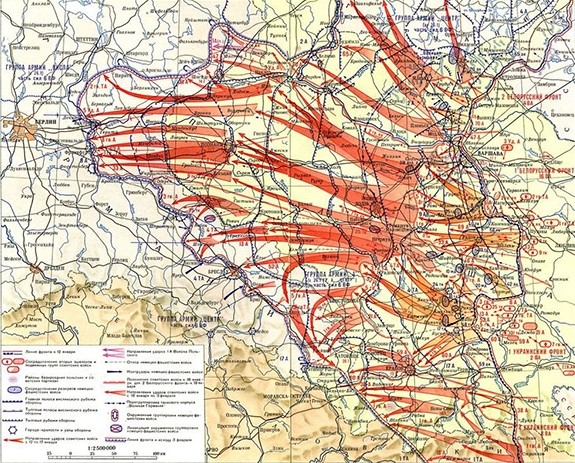 В составе двух фронтов советских войск имелось 16 армий (134 дивизии), четыре танковые и две воздушные армии, пять отдельных танковых и один механизированный корпус, три кавалерийских корпуса, четыре артиллерийских корпуса прорыва, другие соединения и части различных родов войск. Они насчитывали более 2,2 млн человек, 36 436 орудий и миномётов, 7049 танков и самоходных артиллерийских установок, 4772 самолёта. Наступление начиналось в условиях подавляющего превосходства советских войск в силах и средствах».