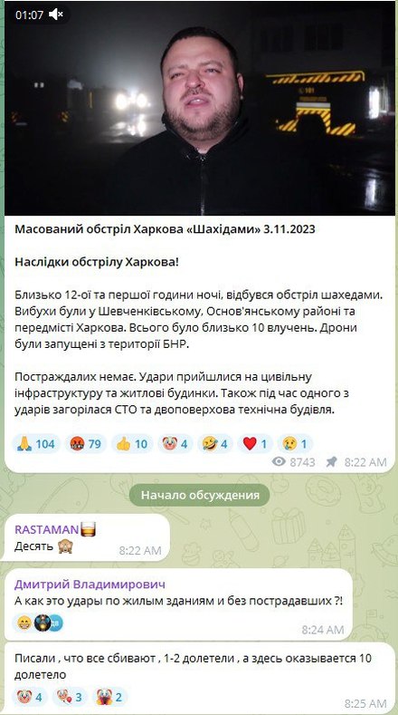 По информации спикера Харьковской областной прокуратуры Дмитрия Чубенко, около 00:00 и 01:00 Харьков атаковали, по меньшей мере, 10 БПЛА.