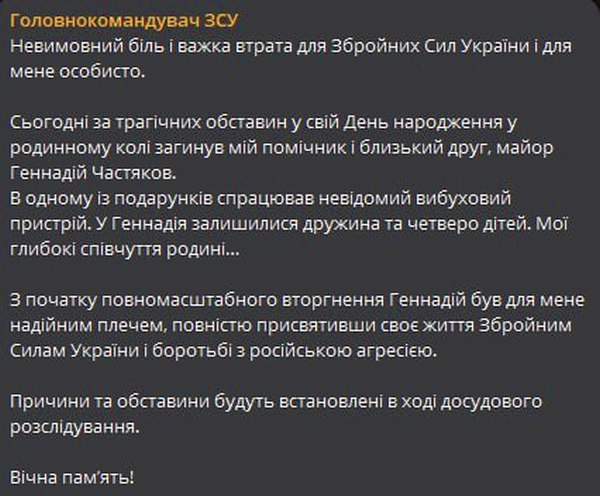Валерий Залужный подтвердил гибель помощника. «Сегодня при трагических обстоятельствах в свой День рождения в кругу семьи погиб мой помощник и близкий друг, майор Геннадий Частяков», — написал он в соцсетях. По версии Залужного, помощник погиб из-за сработавшего в одном из подарков неизвестного взрывного устройства. Фото 20