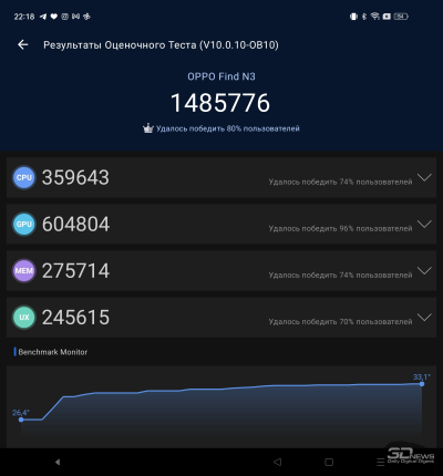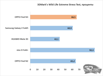 В бенчмарках смартфон демонстрирует ожидаемо очень высокие результаты, сопоставимые с оценками других смартфонов на базе Snapdragon 8 Gen 2. Но при этом Find N3 демонстрирует удивительно высокую производительность графического процессора: в GFXBench и 3DMark новинка с заметным отрывом обогнала все другие складные смартфоны, включая Samsung Galaxy Z Fold5 на том же Snapdragon 8 Gen 2. Да и в AnTuTu 10 высокая оценка GPU позволила новинке OPPO на 100 тыс. баллов опередить конкурента от Samsung. Как бы то ни было, в любых играх смартфон сможет обеспечить максимальный FPS, приложения открываются моментально, недостатка в производительности и скорости процессора вы не почувствуете ни при каких раскладах.