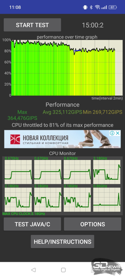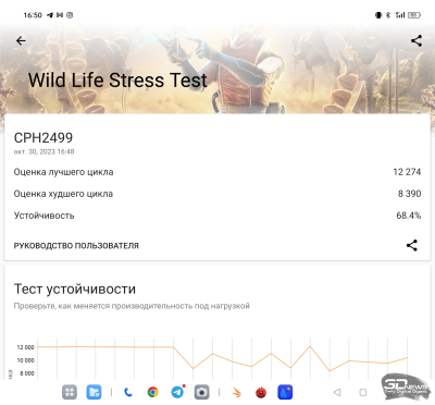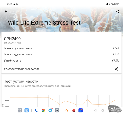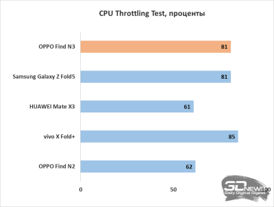 Во время тестов смартфон нагрелся, но нельзя сказать, что чрезмерно, — просто это хорошо ощущалось тактильно. Казалось бы, из-за тонкого корпуса можно было ожидать серьёзных проблем с перегревом или снижения производительности. Но механизмы сброса частот процессора не позволяют смартфону перегреваться, при этом не допуская чрезмерного троттлинга. Ресурсные тесты из пакета 3DMark выявляют понижение частот максимум на 33,5 %, а CPU Throttling Test — на 19 %. Да, смартфон троттлит, но даже меньше, чем среднестатистический аппарат на Snapdragon 8 Gen 2.