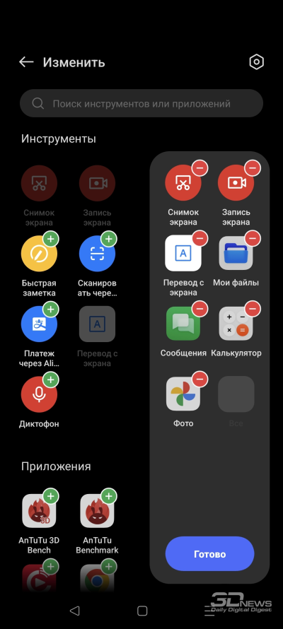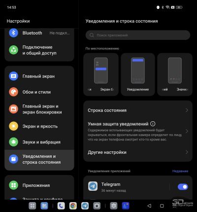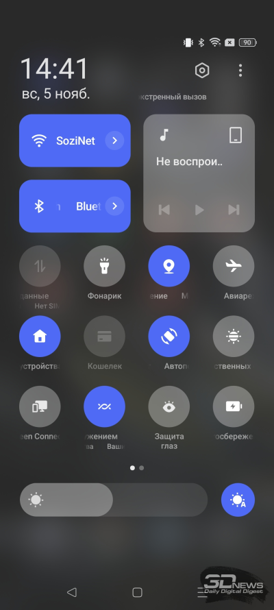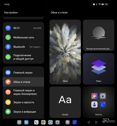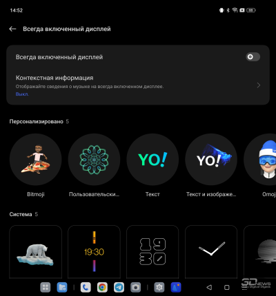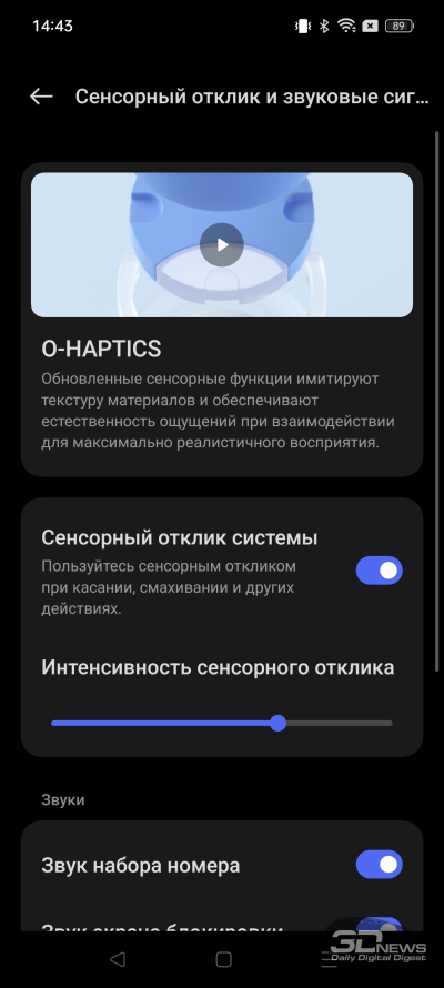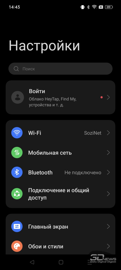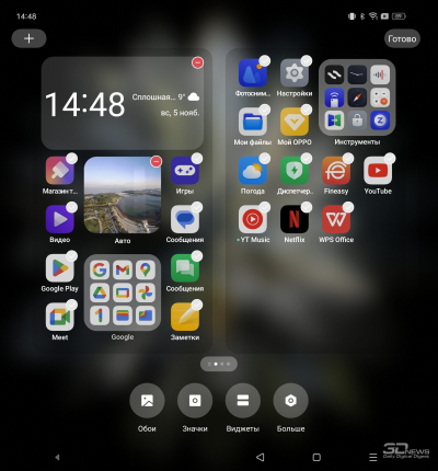 В настройках дисплея можно выбрать светлую или тёмную тему, отрегулировать яркость, изменить размер шрифтов и масштаб значков (стандартные или маленькие), настроить режим «защиты глаз» (фильтр синего, делающий картинку более тёплой и тем самым понижающий нагрузку на зрение) и активировать адаптивный спящий режим (смартфон не будет отключать экран, когда вы смотрите на него). Есть уйма настроек отображения информации на заблокированном экране и типичный для смартфонов OPPO набор программного улучшения изображения: можно повысить резкость, расширить цветовую гамму для SDR-видео, увеличить яркость при воспроизведении HDR-контента. Есть ещё три режима цветопередачи: «Натуральный», Pro (с цветовой температурой D65) и «Яркие цвета» (расширенное цветовое пространство). Для каждого пресета можно индивидуально регулировать цветовую температуру. Также можно активировать «Режим естественных оттенков», в котором смартфон будет подстраивать цветопередачу с учётом окружающего освещения — на манер Apple True Tone.