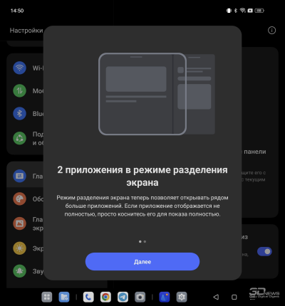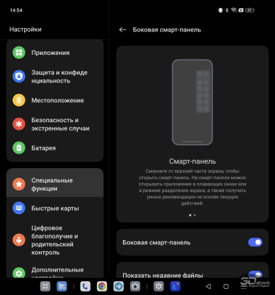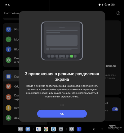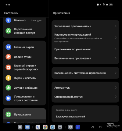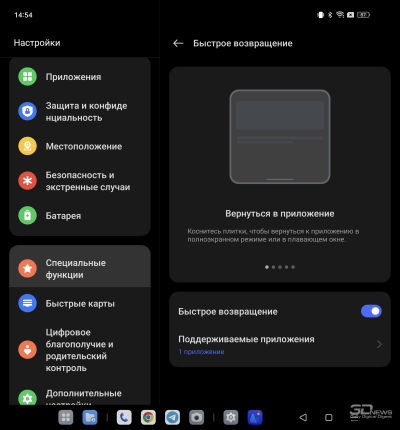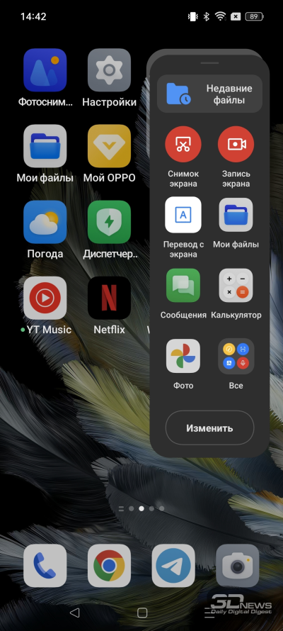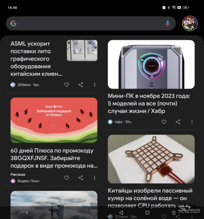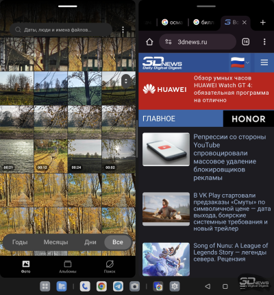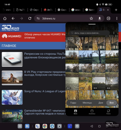 Отдельно хотелось бы отметить технологию OPPO Boundless View для повышения многозадачности, на которой акцентирует внимание сам производитель. С помощью данной технологии смартфон Find N3 может параллельно запустить на большом внутреннем экране до трёх приложений в полноэкранном режиме. Одно приложение в таком случае занимает почти весь дисплей, а одно или два других располагаются за его пределами, но во всё том же полноэкранном режиме, показываясь лишь немного сбоку или снизу. Чтобы перейти к другому приложению, нужно лишь провести по экрану в нужную сторону. Можно по-разному группировать приложения и регулировать размеры их окон. Отмечу, что окна трёх одновременно открытых приложений выглядят миниатюрно, лучше не открывать больше двух.