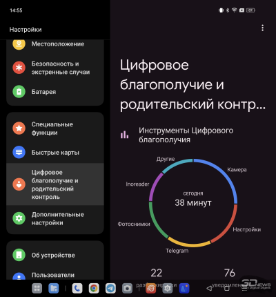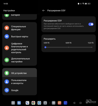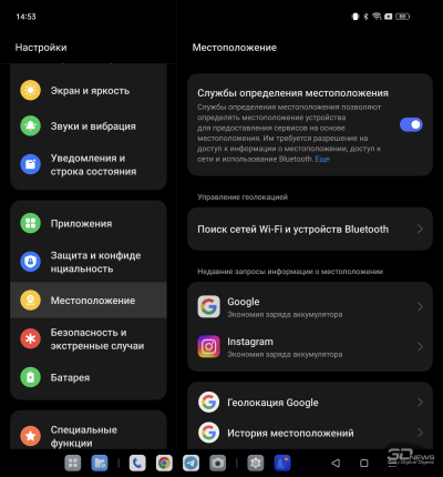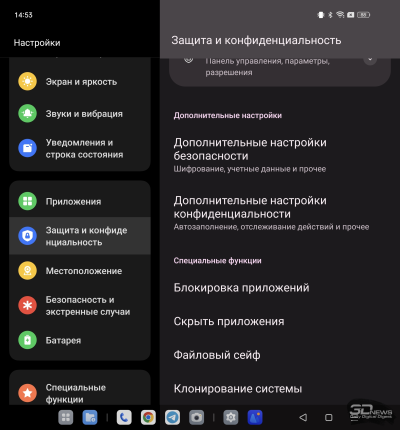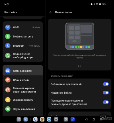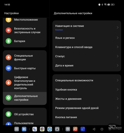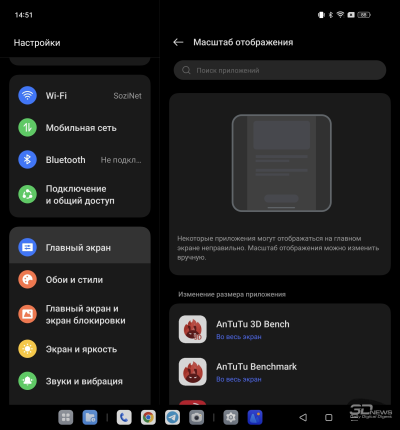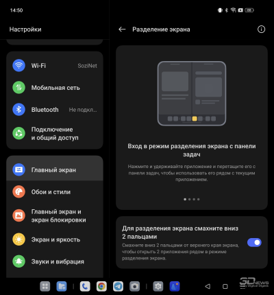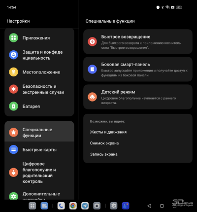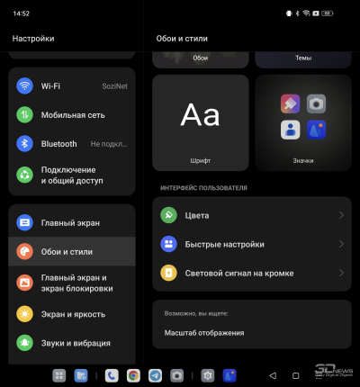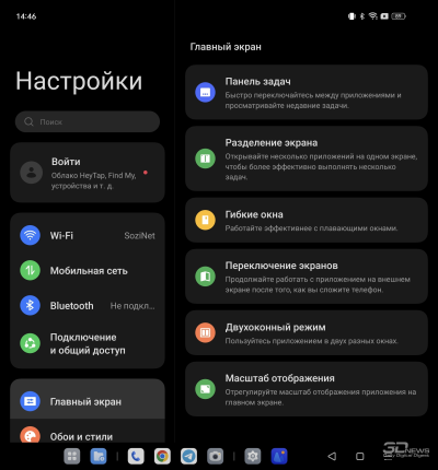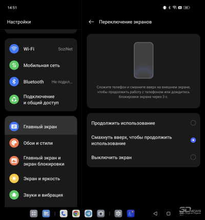 На внешнем экране как операционная система, так и все приложения отображаются точно так же, как на обычных смартфонах. На внутреннем экране интерфейс имеет скорее планшетный вид, что, в общем-то, и не удивительно. Внизу расположилась панель быстрого доступа к файлам, избранным и последним открытым приложениям, которая доступна на экране всегда, в том числе и в некоторых приложениях; в играх это меню скрывается. На месте и разделённая на две части клавиатура в разложенном виде (в настройках можно выбрать и цельную клавиатуру, если вам так удобнее); и отображение некоторых приложений в «настольном» формате (например, Google Chrome с панелью вкладок); а также очень гибкие настройки интерфейса, причём раздельные для внутреннего и внешнего экрана.