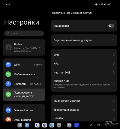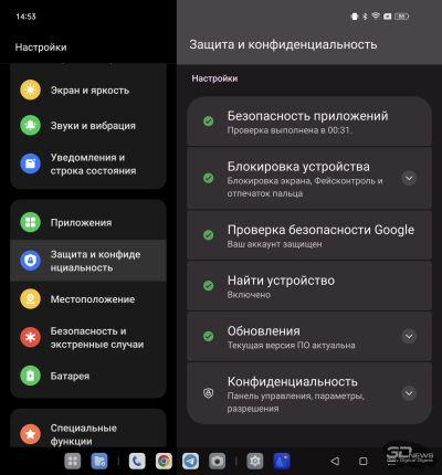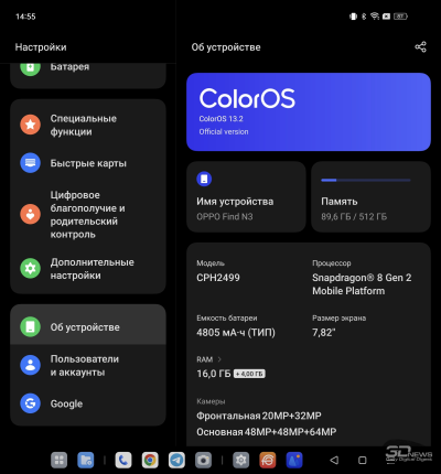 OPPO Find N3 работает под управлением Android 13 с оболочкой ColorOS 13.2, адаптированной под складной смартфон. Оболочку ColorOS 13 мы видели ещё у OPPO Find N2, правда, тогда у нас на тесте побывала китайская версия смартфона, у которой есть незначительные отличия в интерфейсе вроде странных непереведённых с китайского языка разделов — здесь подобного нет.
