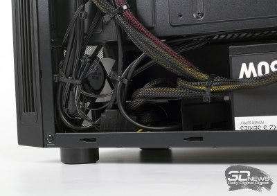 Передняя панель корпуса не имеет пылевого фильтра, поэтому системный блок придется часто чистить. Место под установку блока питания оснащено пылесборником, верхняя стенка — тоже. При желании сюда — сверху — можно установить радиатор необслуживаемой СЖО.