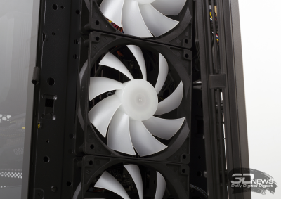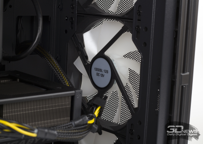 Strike 520 оснащен четырьмя 120-мм вентиляторами: три вертушки, закрепленные на передней панели, работают на вдув, четвертая (задняя) — на выдув. «Карлсоны» оснащены подсветкой, управлять которой можно при помощи переключателя на передней панели корпуса. Доступны несколько цветов и режимов. Процессорный кулер оснащен полноценной RGB-подсветкой — он подключен к материнской плате. Корпусные вентиляторы «молотят» с постоянной частотой и уровнем шума. Регулировать скорость вращения крыльчаток не получится, так как они не подключены к матплате.