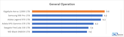 Gigabyte Aorus 12000 позиционируется производителем как самый быстрый потребительский накопитель с интерфейсом PCIe 5.0, а значит, и вообще. Поэтому сравнивать его целесообразно с прочими флагманскими моделями, среди которых есть как быстрейшие SSD для PCIe 4.0 (например, Samsung 990 Pro и WD Black SN850X), так и накопители на платформе Phison E26, но с более медленной памятью (например, Adata Legend 970).