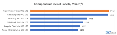 Зато при копировании файлов с накопителя рассматриваемый Aorus 12000 может похвастать превосходством над всеми конкурентами. Использование памяти с 2000-МГц интерфейсом позволяет ему поднять скорость однопоточного чтения в Windows на 7 % относительно накопителей на Phison E26 первого поколения.