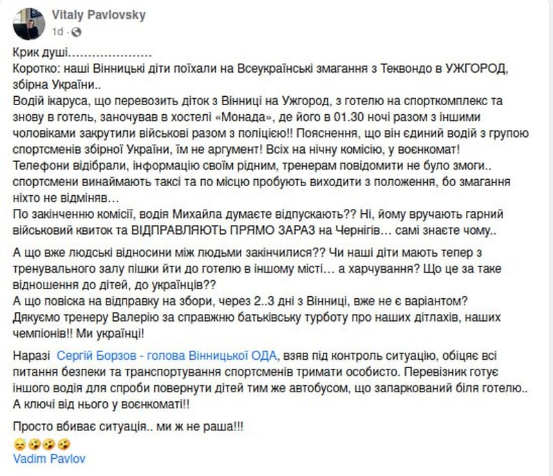 Напомним, 12 ноября в Ужгороде представители ТЦК посреди ночи забрали водителя автобуса, который привёз детей на соревнования по тхэквондо из Винницкой области.