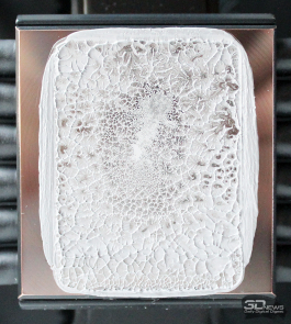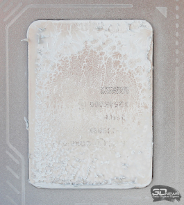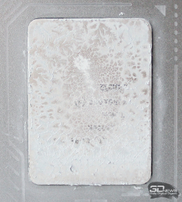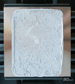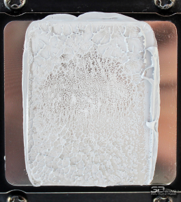 При этом тактильно поверхность совершенно гладкая, никаких шероховатостей нет. Основание немного выпуклое точно по центру, но отпечаток теплораспределителя процессора конструктивного исполнения LGA1700 на нём получился по всей его площади с характерным акцентом на центральной части.