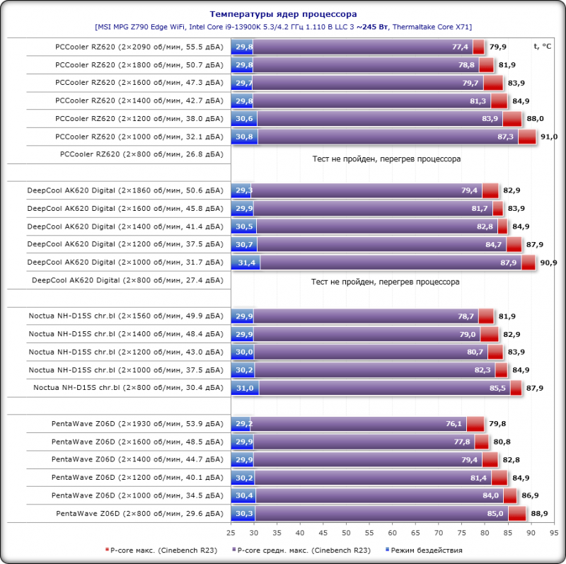 Максимальные температуры: PCCooler RZ620 – 88 °C, DeepСool AK620 Digital – 89 °C, PentaWave Z06D – 85 °C, Noctua NH-D15S – 89 °C. То есть номинально новинка на втором месте (хотя и с более высоким уровнем шума), а разница с DeepСool и Noctua минимальна. А вот PentaWave в лидерах – три градуса Цельсия при максимальном разгоне процессора имеют значение.
