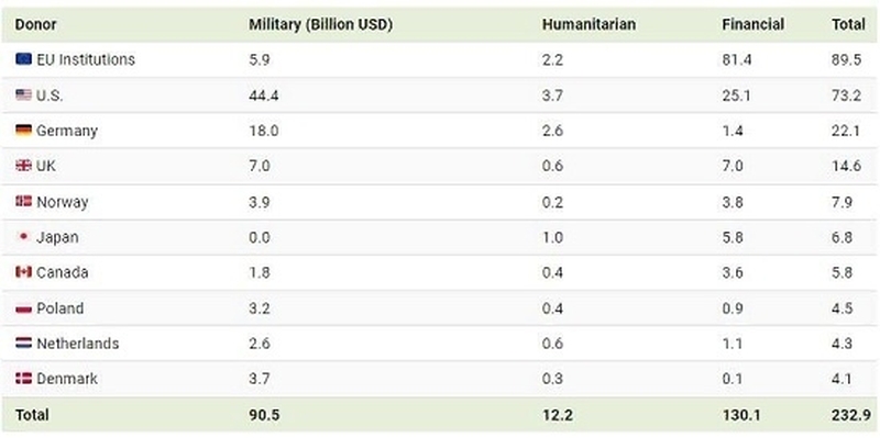 На первом месте по размеру помощи — Европейский союз, направивший в общей сложности на нужды Украины 90 миллиардов долларов, в которых превалирует прямая финансовая помощь (81 млрд долларов).