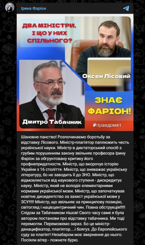 «Начинаем борьбу за отставку Лисового. Министр-плагиатор оскорбляет честь украинской науки. Министр диктаторским способом с грубым нарушением закона увольняет профессора Ирину Фарион за обоснованную критику его профнепригодности. Министр, укорачивающий историю Украины с 16 века. Министр, презирающий украинскую литературу, потому что не заводит ее во ВНО. Министр, отказывающийся от ученой степени, — дискредитирует науку. Министр, не владеющий элементарными нормами украинского языка. Министр, который основал новейшее диссидентство за защиту украинского языка в ВСУ!!!!! Министр, увольняющий за принципиальную позицию, мировоззрение и нациоцентрический чин. Полная обструкция!!!!! Следом за Табачником пошел! В свое время я была автором постановления об отставке Табачника. Мы тогда победили. Победим сейчас. Потому что это министр-денацификатор, плагиатор... и трус. В Европейский суд за плагиат!» — написала она в своём ТГ-канале.