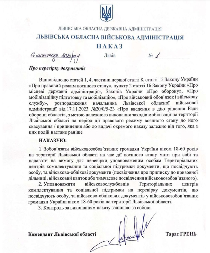 Об этом говорится в приказе коменданта Львовской области Тараса Греня.