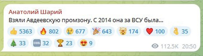 «Сегодня вечером Авдеевская промка наконец полностью освобождена от ВСУ. Хохол сидел там с 2014-го года. Теперь выбит. Вражеские ресурсы подтверждают. Для нацистов это серьёзный удар. Промзона — важная часть всего Авдеевского укрепрайона, который заявлялся бандеровской пропагандой как неприступный», - написал военкор Юрий Котенок в своем телеграм-канале в 9 часов вечера.