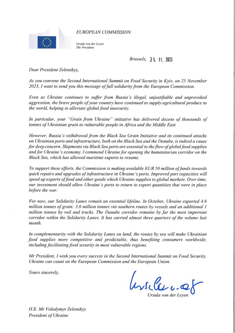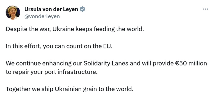 «Несмотря на войну, Украина продолжает кормить мир. В этих усилиях вы можете рассчитывать на ЕС. Мы продолжаем расширять наши "линии солидарности" и предоставим 50 миллионов евро на ремонт вашей портовой инфраструктуры», — написала она в соцсети Х (Twitter), прикрепив письмо главе киевского режима Владимиру Зеленскому, где ЕС уведомляет его о выделении упомянутой ею помощи.