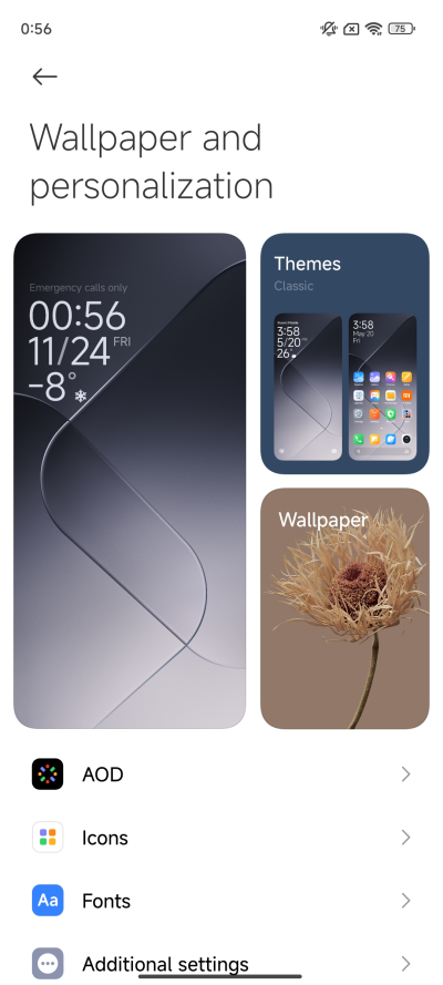 Что не изменилось в HyperOS относительно MIUI, так это настройки экрана. Они ровно те же, что у предыдущих флагманских Xiaomi: можно включить режим отображения информации на заблокированном экране (Always-On Dislpay), причем с разнообразной анимацией на выбор (теперь – в связке с темой оформления экрана блокировки); есть специальный режим чтения с теплым тоном экрана, регулировки шрифтов, темный режим c возможностью его настройки, составления расписания и выбора для конкретных приложений, специальные параметры для работы с VR. Имеются и различные «улучшайзеры» картинки с применением ИИ: смартфон умеет добавлять дополнительные кадры в изображение для повышения плавности, повышать видимое разрешение и подгонять SDR-картинку под HDR-стандарты. Есть и пара свежих моментов – режим чтения (настраиваемый, в том числе и подстраивающийся под дневное/вечернее время и конкретное приложение) и новые системные анимации (их можно только включить/выключить, но не настраивать). Параметры цветопередачи примерно те же: автоматическая регулировка в зависимости от освещения, яркий и насыщенный режимы, а также расширенные настройки, где можно самостоятельно выбрать цветовое пространство; из нового – режим Original Color PRO (да, капсом) – утверждается, что в нем цвета будут максимально реалистичные. По умолчанию при этом выставлен режим ярких цветов. Я протестировал экран Xiaomi 13 Pro с настройками Original Color PRO, Vivid, Saturated и Original из подпапки Advanced settings (смартфон автоматически определяет цветовой охват текущего изображения и подстраивает картинку).