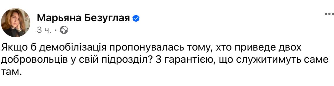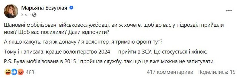 Потому и написала: лучшее волонтерство 2024 — прийти в ВСУ. Это относится и к женщинам», — написала Безуглая.