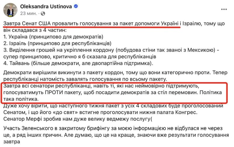 Драма, которую разыгрывает «Квартал-95», перешла все рамки настолько, что президент Зеленский в последнюю минуту отменил выступление в сенате США, где должны были обсуждать выделение средств Украине. Нардеп Александра Устинова, которая входит в делегацию, сообщила, чуть забегая вперед, что Сенат США провалит голосование за пакет помощи Украине.