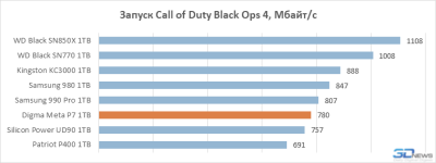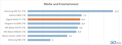 Достойно смотрится Digma Mеta P7 и в роли игрового накопителя — в 3DMark он выступает на равных как с безбуферным WD Black SN770, так и с оснащённым DRAM-буфером накопителем высокого уровня Kingston KC3000. Однако до уровня лучшего игрового SSD с интерфейсом PCIe 4.0, WD Black SN850X, он не дотягивает.