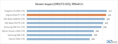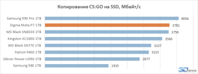 Если копировать файлы с Digma Mеta P7 на другой носитель информации или, наоборот, копировать файлы на него (но не более 50 Гбайт), то производительность получается более чем конкурентоспособной. Однако существует ещё один сценарий, связанный с работой с файлами, — когда все операции осуществляются внутри одного и того же накопителя. В этом случае контроллеру SSD приходится одновременно обрабатывать два разнонаправленных потока данных, что требует от него куда больших усилий. И при такой нагрузке Digma Mеta P7 уже не удаётся полностью слиться с флагманской группой.