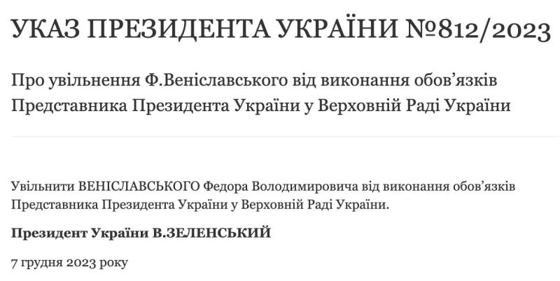 Президент Украины Владимир Зеленский уволил нардепа Федора Вениславского с должности своего представителя в Верховной раде.