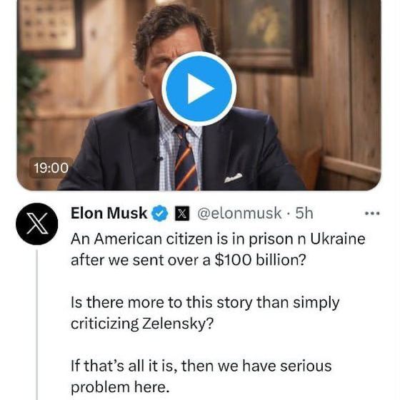 «Американский гражданин сидит в украинской тюрьме после того, как мы отправили им $100 млрд? Может, дело не только в критике Зеленского? Потому что если только в ней, то у нас большие проблемы», — отреагировал миллиардер Илон Маск на передачу Карлсона о чилийско-американском журналисте миллиардер Илон Маск.
