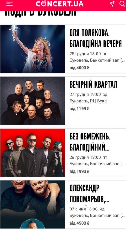 Гостей популярного курорта Буковель в Карпатах на новогодние праздники будут развлекать звёзды украинского шоу-бизнеса. Выступать перед ними будут Ольга Полякова, Юрий Горбунов, Александр Пономарев, DZIDZIO, группа «Без ограничений», а также «Вечерний квартал». Билеты на их концерты, как и само проживание в Буковеле, недешевы.