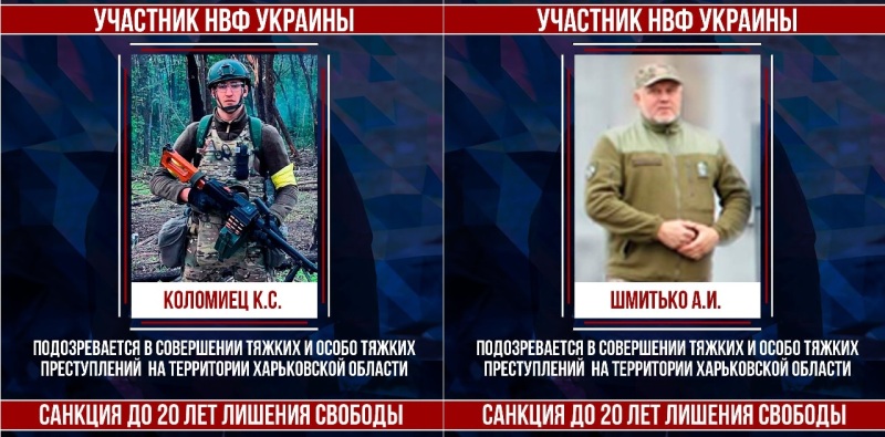 Так, в совершении преступлений, предусмотренных ч.5 ст.33, ч.2 ст.119, п. «б» ч.2 ст.158, ст.166, ст.167 и ст.208 УК РФ разыскивается военный преступник, участник НВФ «Kraken» Кирилл Сергеевич Коломиец, а по ч.4 ст.356.1и ст.276 УК РФ – военный преступник, участник НВФ, боец 113 бригады ТРО Андрей Иванович Шмитько. Им «светит» до 20 лет лишения свободы.