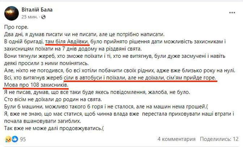 108 ВСУшников получили недельный отпуск на рождественские праздники, выехали из Авдеевки на автобусах, но не доехали и погибли. Официально киевские власти об этом не сообщали.