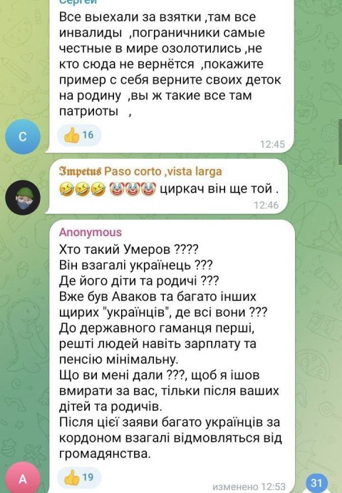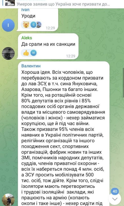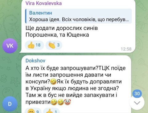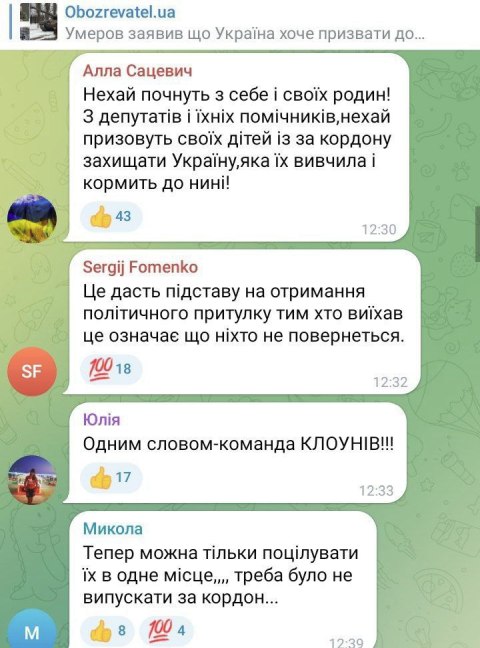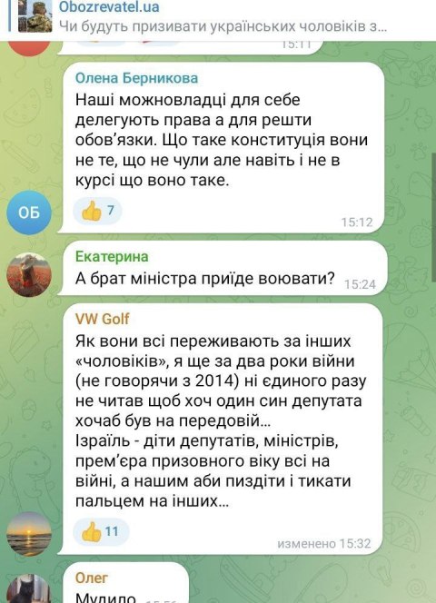 Украинцы бурно отреагировали на ужесточение мобилизации, особенно находящихся за границей мужчин. Они предлагают начать западную мобилизацию с сыновей Ющенко, Порошенко, Данилова, детей-мажоров чиновников и депутатов. По их мнению, это «железный» повод больше никогда не возвращаться на Украину.