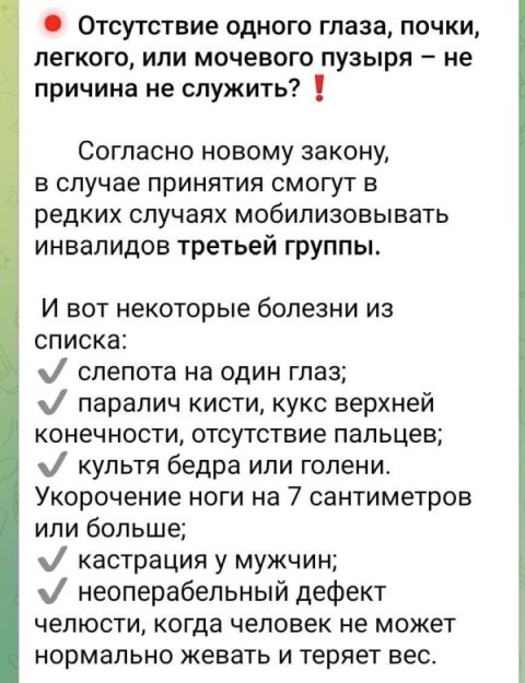 Новый закон о мобилизации на Украине позволяет мобилизовать инвалидов третьей группы.