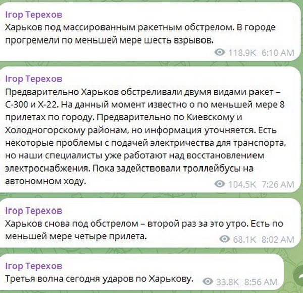 С 5 до 8 утра в Харьков прилетело 22 ракеты, большинство в Киевском и Холодногорском районах.