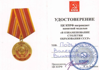 В честь памятной даты — годовщины Договора об образовании СССР от 30 декабря 1922 года — в Симферополе состоялась церемония награждения медалью ЦК КПРФ «В ознаменование столетия образования СССР». Кстати, первым, кому была вручена эта награда год назад, был Президент России Владимир Путин. По поручению председателя партии Геннадия Зюганова депутат Госсовета Республики Крым, руководитель крымского регионального отделения КПРФ Сергей Богатыренко вручил награды и нескольким крымчанам.