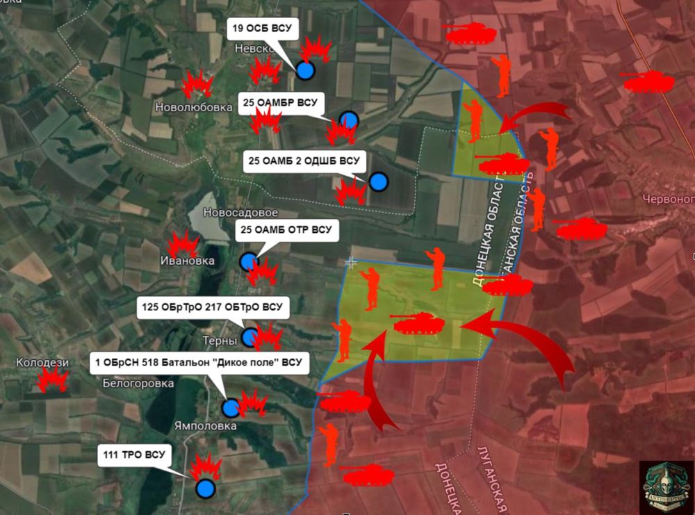 Подразделения ВС России методично продавливают оборону ВСУ в районе населённых пунктов Терны и Ямполовка. По опубликованным противником кадрам, фиксируется продвижение российских войск к северу от балки Широкий овраг.