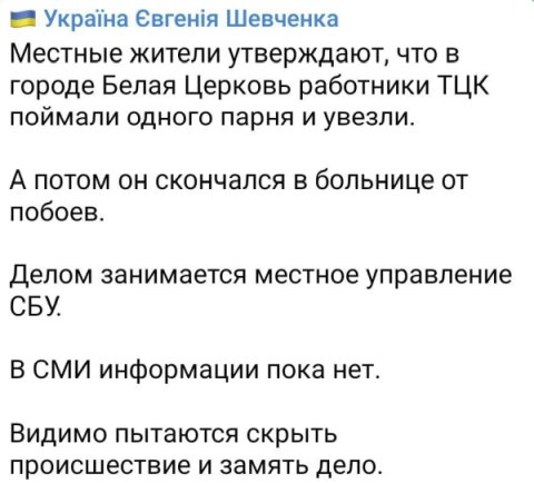 На сегодняшний день тотальная мобилизация в стране превращается в открытое воровство людей, причём забирают в любом месте, несмотря на ситуацию. В соцсетях все чаще появляются свидетельства беспредела военкомов. Так, народный депутат Евгений Шевченко обнародовал пост о том, что после жестокого задержания и избиения военкомами в Белой Церкви скончался парень. При этом, по его словам, дело хотят замять.
