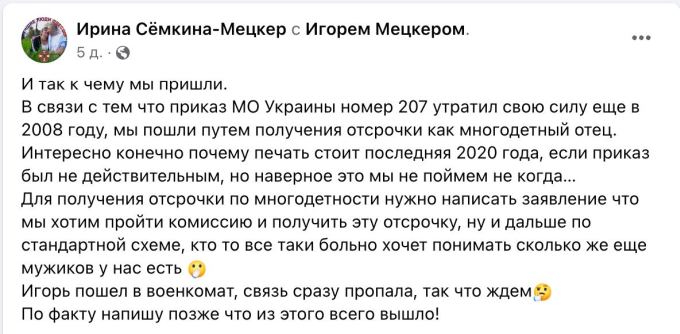 «В связи с тем, что приказ Минобороны №207 утратил свою силу еще в 2008 году, мы пошли путем получения отсрочки как многодетный отец. Для получения отсрочки по многодетности нужно написать заявление, что мы хотим пройти комиссию и получить эту отсрочку, ну и дальше по стандартной схеме. И вуаля, а таки можно. Мы "выключены" с военного учета и свободно можем ездить куда хотим!» — написала его женщина.