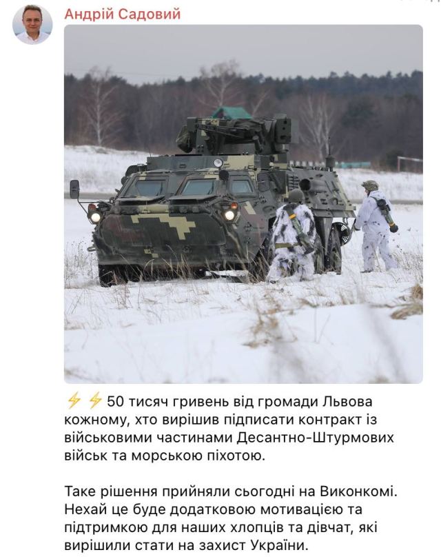 Львовские власти решили заманить украинцев в ВСУ «рублём» и обещают каждому местному жителю, кто подпишет контракт с военными частями десантно-штурмовых войск и морской пехотой, выплатить по 50 тысяч гривен.